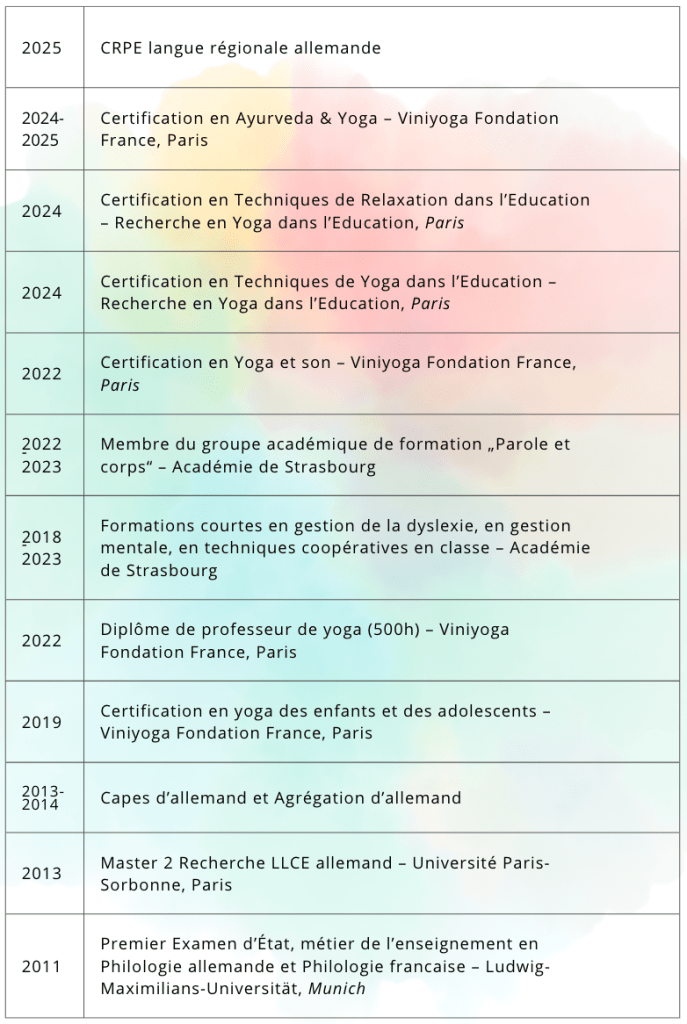 Enseignante agrégée, professeure de viniyoga et de yoga adapté à l’éducation, practicienne de techniques coopératives, maman de deux enfants, je suis passionnée par la pédagogie, les relations humaines et la nature. Je mets ma créativité au service du vivant pour favoriser le bien-être et l’épanouissement.